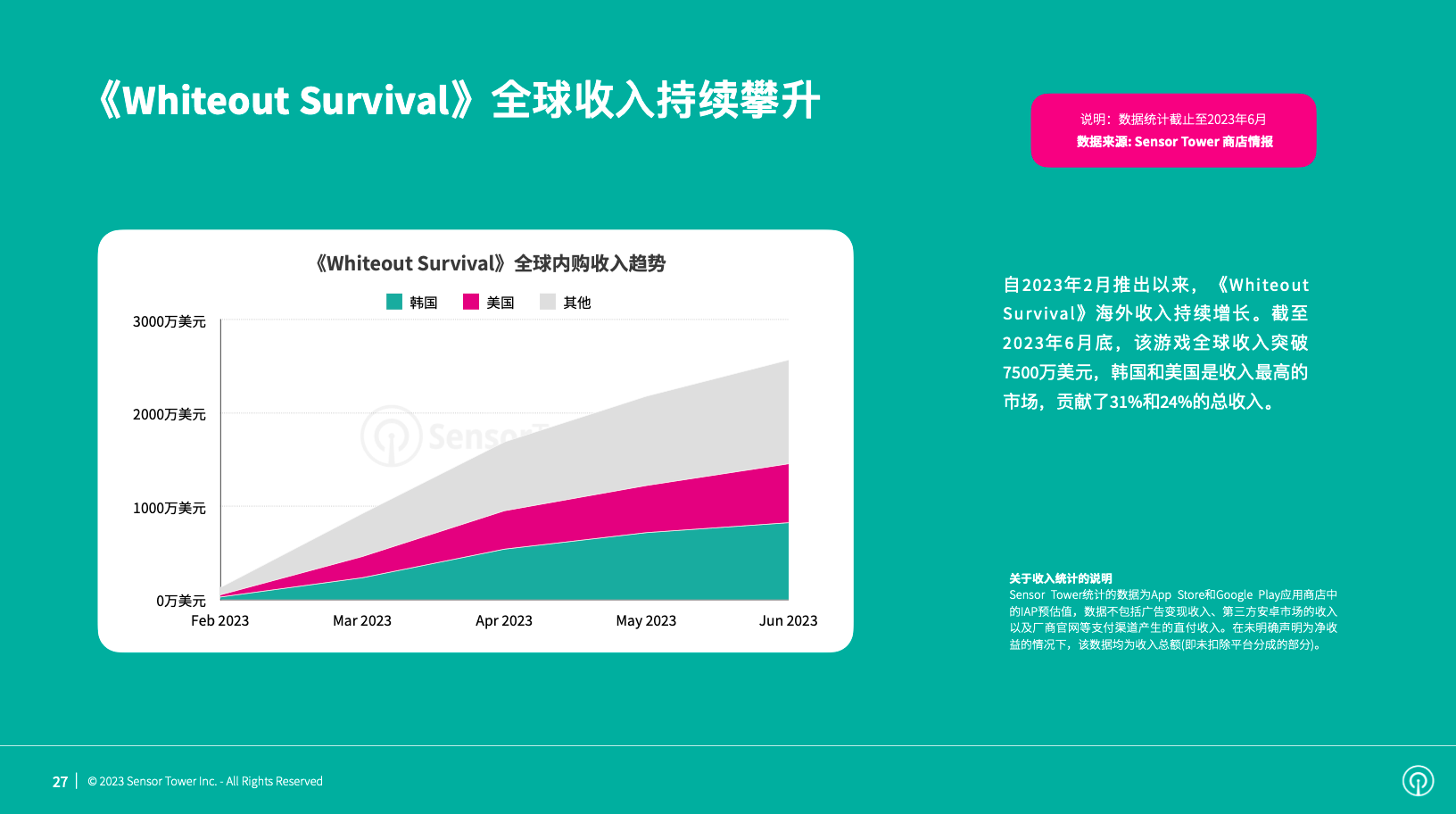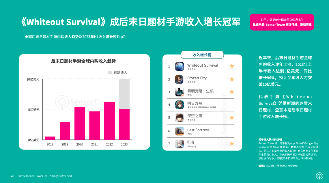 随着末日题材手游全球收入的持续攀升,《Whiteout Survival》自2023年2月发布以来全球吸金超7500万美元(截至2023年6月30日),登顶本期末日题材手游收入增长榜。