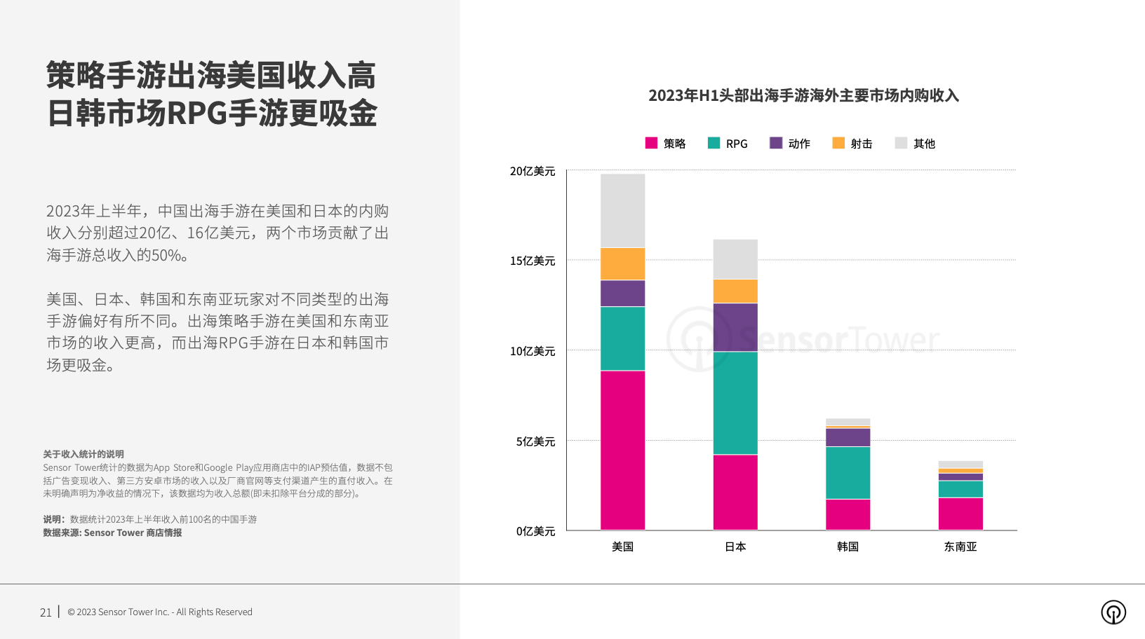 2023年上半年,美国和日本市场手游内购收入达110亿和70亿美元,来自中国的手游产品在这两个市场的收入分别超过20亿、16亿美元,占中国手游出海总收入的50%。