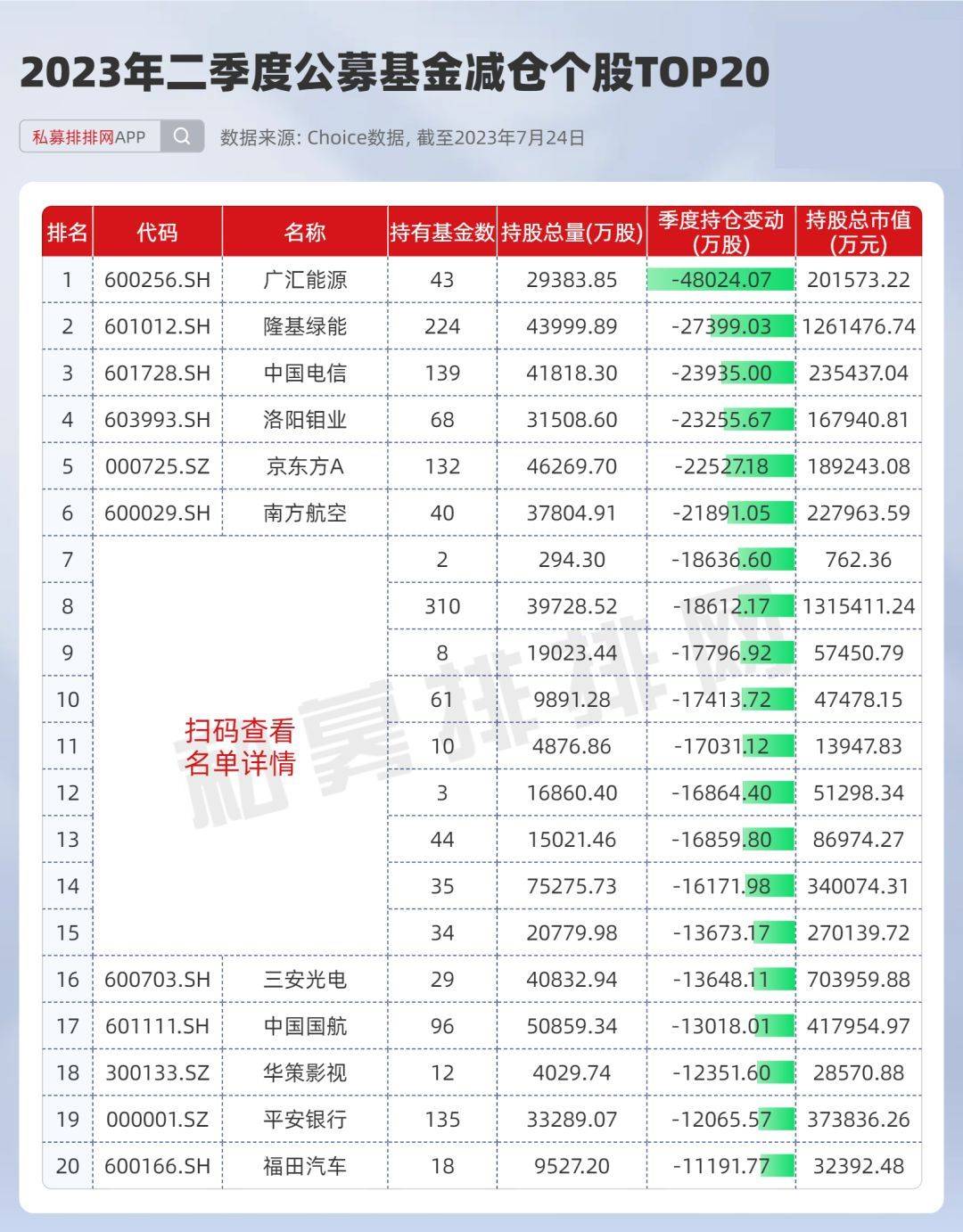 在减仓方面,广汇能源、隆基绿能、中国电信、洛阳钼业、京东方A、南方航空等被公募基金大幅减持,数量均超过2亿股。