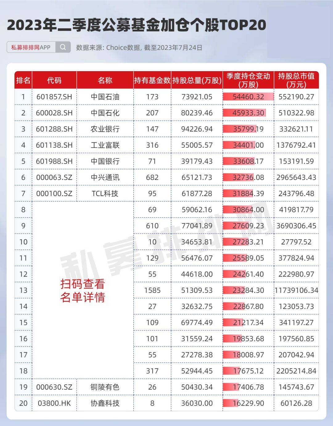 在加仓方面,二季度公募基金整体增持数量前三的个股分别是中国石油、中国石化、农业银行,分别增持了5.45亿股、4.59亿股、3.58亿股。另外,工业富联、中国银行、中兴通讯、TCL科技、恒瑞医药等多股被增持数量也均超过2亿股。
