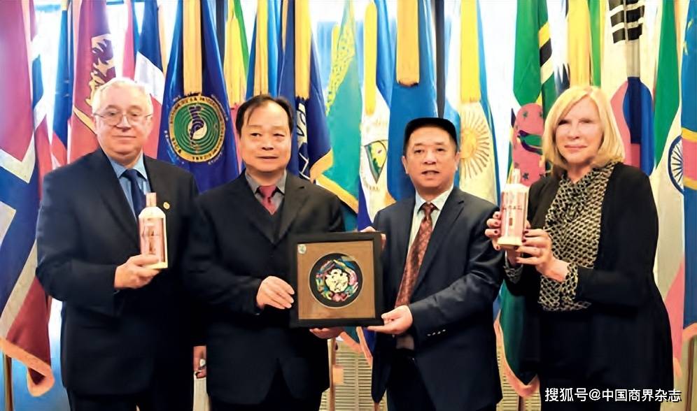 2018年,黄永毅总裁向联合国可持续发展目标管理国际组织安德烈主席(左一)、莫妮卡副主席(右一)赠送贵人酒。