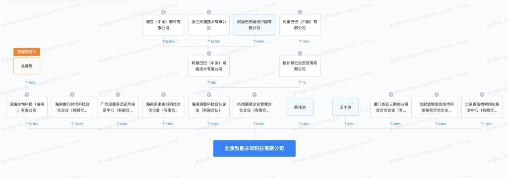 目前,吴德周通过深海生物科技(海南)有限公司持有致敬未知 34.58% 股份,为公司第一大股东;阿里通过杭州灏星企业管理合伙企业(有限合伙)间接持股 5.76%。