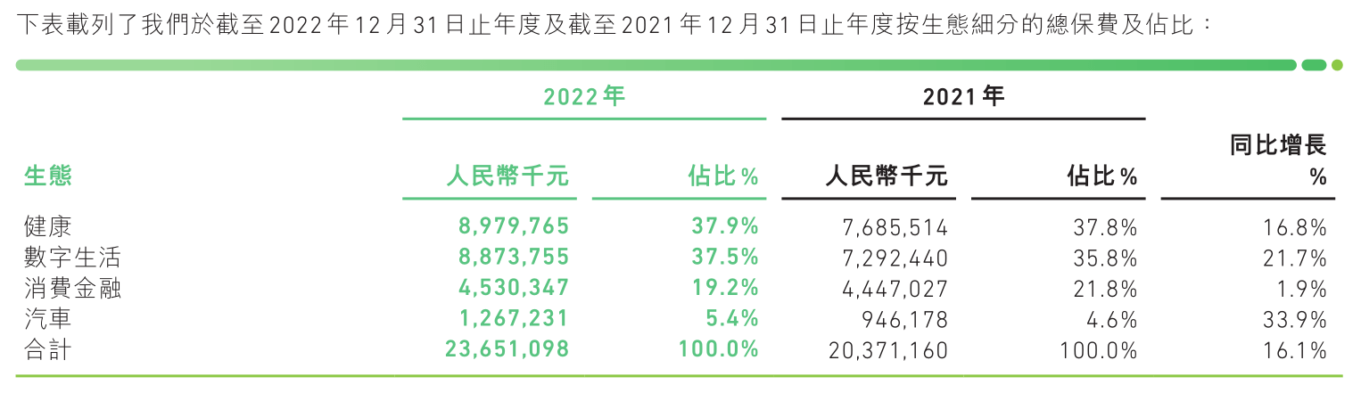以生态看,则相比2021年同期,众安在线健康、数字生活、消费金融、汽车四大生态的保费收入均有所增长,其中,健康生态保费收入最高、汽车生态总保费增长最快。