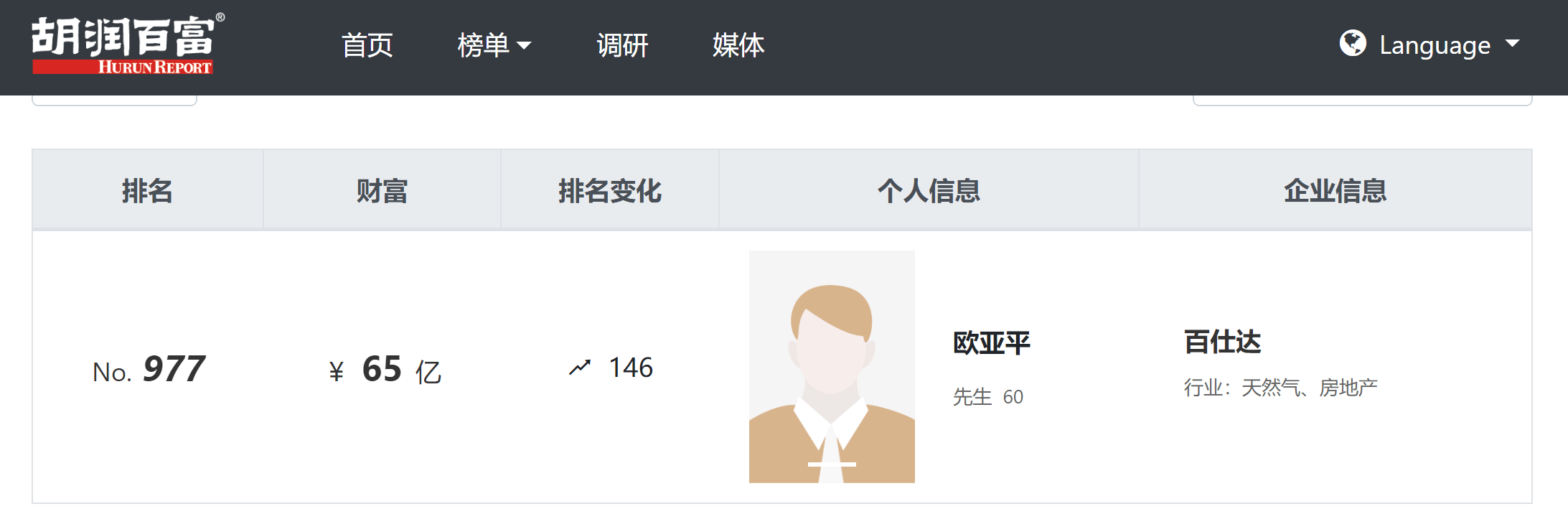 2002年,在福布斯中国大陆100强富豪中,欧亚平便曾排名37位。2022年11月,欧亚平仍以65亿元财富上榜《2022年衡昌烧坊·胡润百富榜》。