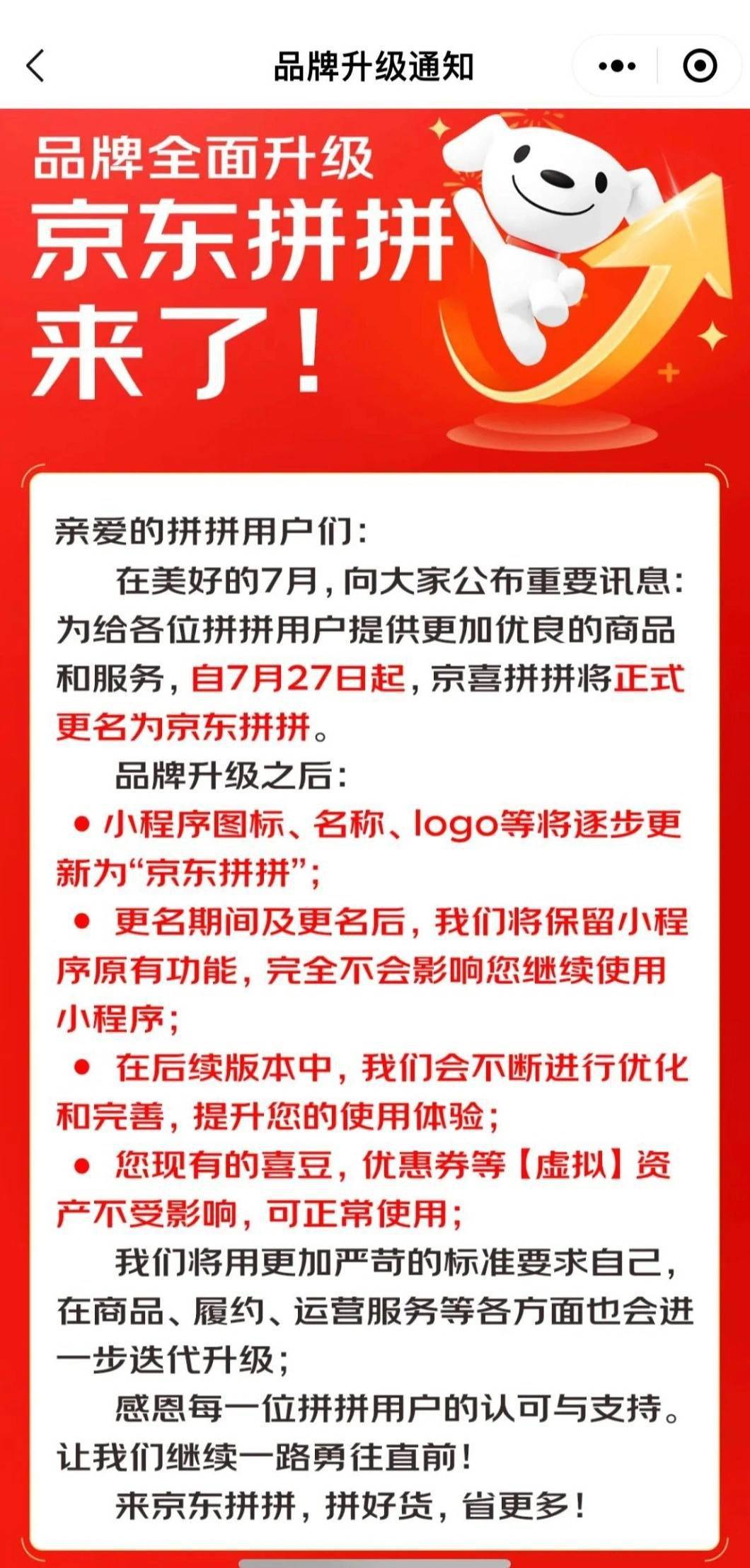 DoNews7月25日消息,京东京喜拼拼发布品牌升级公告。公告称,自 27 日起,将正式更名为京东拼拼。