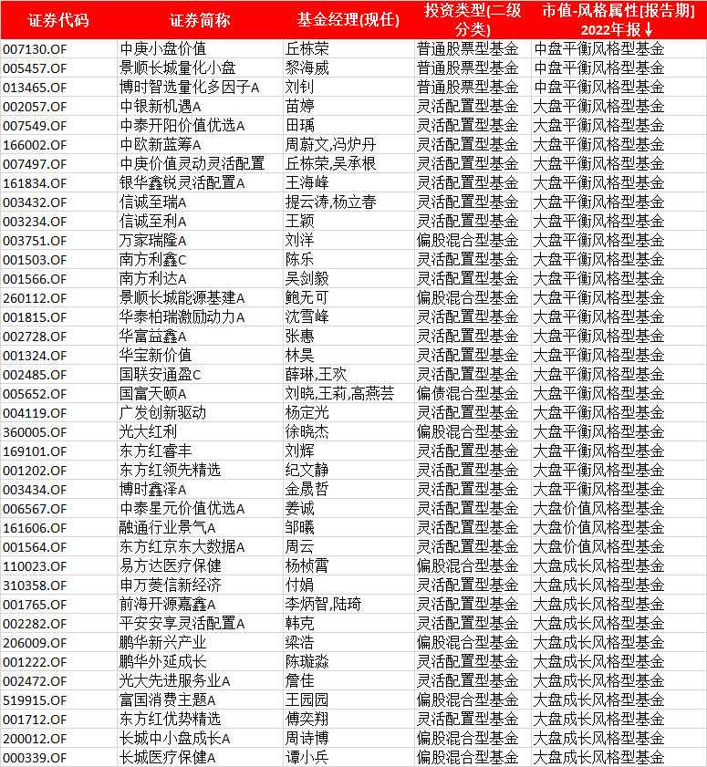 可以看到东方红欣和平衡两年混合(FOF)在2022年年报中披露持有的78只基金中,多数主动权益产品为大盘平衡型和大盘价值型,基金经理投资风格偏向深度价值,如丘栋荣、周蔚文、鲍无可、姜诚等。