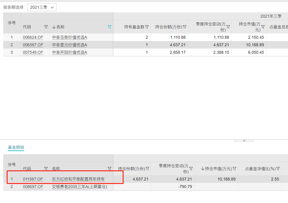 据Wind数据显示,2021年3季报东方红欣和平衡两年混合(FOF)是唯一一只重仓中泰星元价值优选A的FOF,持有4637.21万份,占总规模比高达10.24%。而当时姜诚刚刚崭露头角,共管理3只产品,总规模仅26.85亿元。
