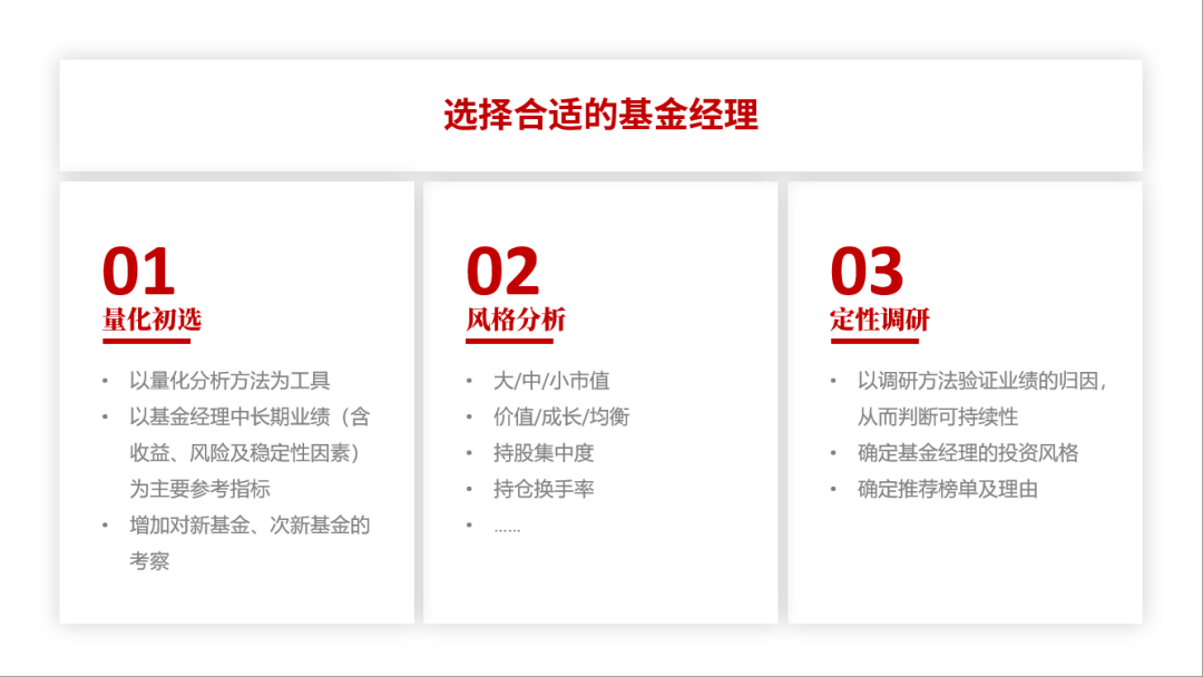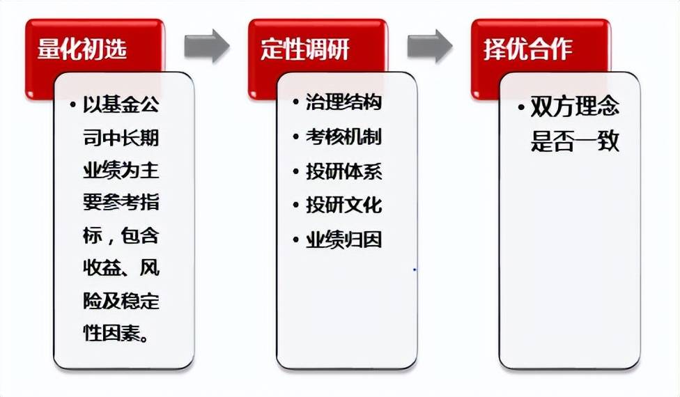 首先是选择优秀的基金管理人,随着优秀公募基金产品日益向头部管理人集中,筛选基金管理人的重要性凸显,通过量化初选、定性调研和择优选择等步骤选择理念一致的基金管理公司。