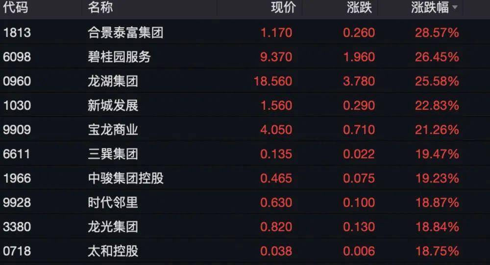 港股地产板块同样走强,合景泰富集团、碧桂园服务、龙湖集团、新城发展等涨超20%,龙光集团、碧桂园、新城悦服务、融创中国、佳兆业集团等股涨超10%。
