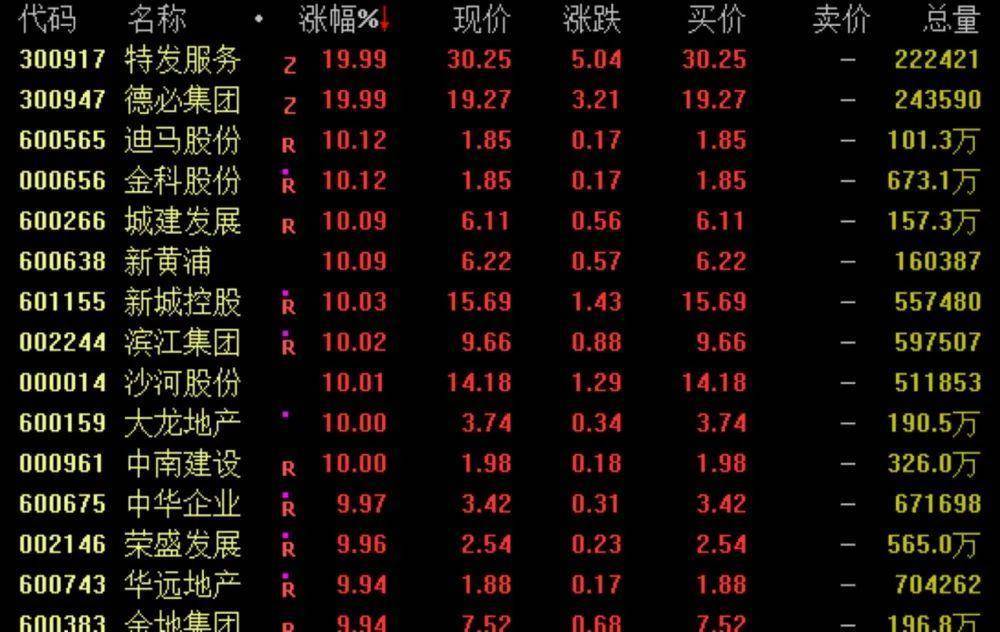25日,A股地产板块强势拉升,截至收盘,特发服务、德必集团“20cm”涨停,金科股份、新城控股、沙河股份等超10股涨停,万科A涨超8%。
