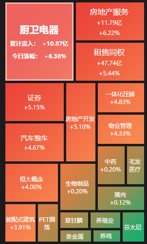 同时,建材板块走强,正源股份、兔宝宝、东方雨虹、蒙娜丽莎涨停,坚朗五金涨8%。家居板块也有拉升,致欧科技、好太太、皮阿诺、金牌橱柜、志邦家居等涨停,箭牌家居、顾家家居涨超9%。