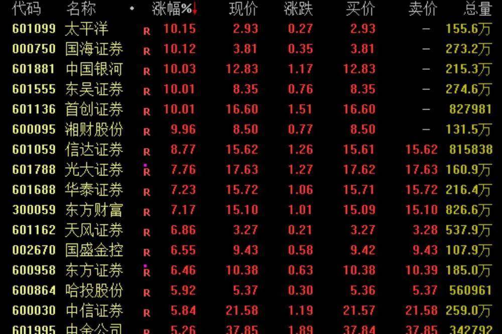 受大利好刺激,券商股早盘全线飘红,板块指数高开高走涨逾4%,开盘仅5分钟的成交就过百亿,远远超过昨日全天约90亿元的成交。