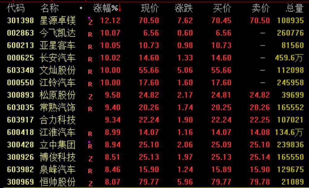 汽车产业股链再度活跃。截至收盘,星源卓镁涨超12%,今飞凯达、亚星客车、长安汽车、江铃汽车、文灿股份等涨停,松原股份、合力科技、常熟汽饰等涨超9%。