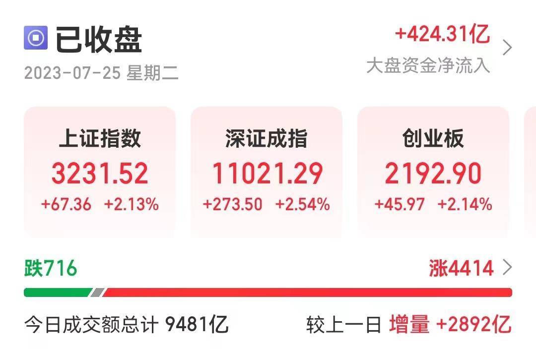 7月25日,早盘三大指数高开高走,全天稳步上扬。截至收盘,三大指数均涨超2%。沪深两市合计成交9481亿元,较昨日增加近2900亿元,超过4400只个股上涨。北向资金净买入近190亿元,单日净买入额创2021年12月以来新高。