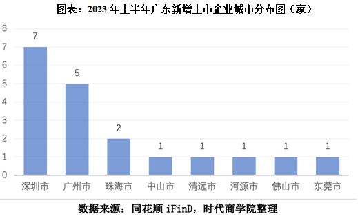 如图表所示,2023年上半年,在广东省各大城市中,深圳市、广州市、珠海市分别以7家、5家、2家的新股数量位居前三,其他城市均为1家。