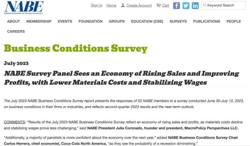 NABE主席Julia Coronado在一份新闻稿中表示:“2023年7月NABE商业状况调查的结果反映出,随着材料成本下降和工资企稳,美国经济面临的挑战降低,企业销售和利润都在上升。”