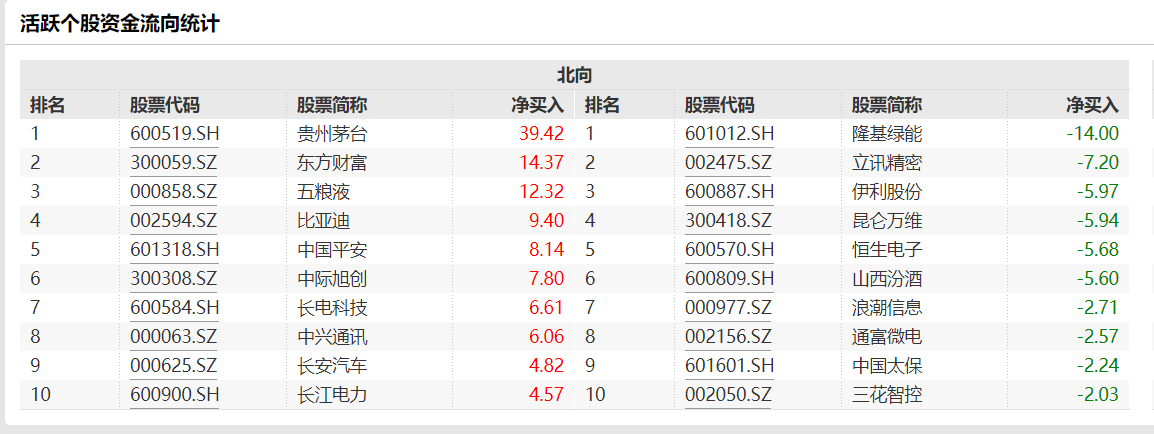 具体到个股情况来看,近7日,北向资金净买入额度前十位的个股中,贵州茅台获逆势大额增持,高居净买入榜首,合计买入39.42亿元。前五位中的其他四只个股分别为东方财富、五粮液、比亚迪(002594)和中国平安(601318),统计期内分别净买入14.37亿元、12.32亿元、9.4亿元和8.14亿元。
