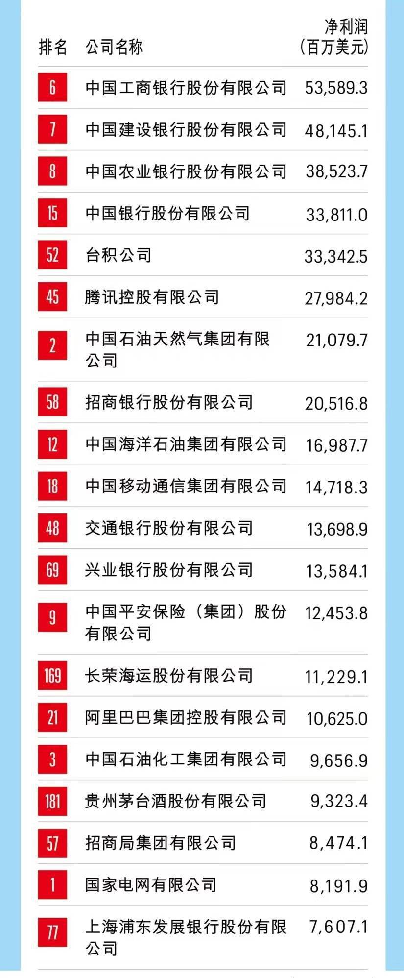 在盈利能力方面,最赚钱的 10 家上榜公司中,除五家商业银行和中石油、中海油、中移动之外,两家私营企业也进入了前十位,其中台积公司以 333 亿美元净利润排在利润榜第 5 位,腾讯的净利润比去年下降了 19%,但仍以超过 279 亿美元的净利润排在利润榜第 6 位。这十家公司在去年的总利润约为 3,087 亿美元,约占上榜公司利润总和的 43%。