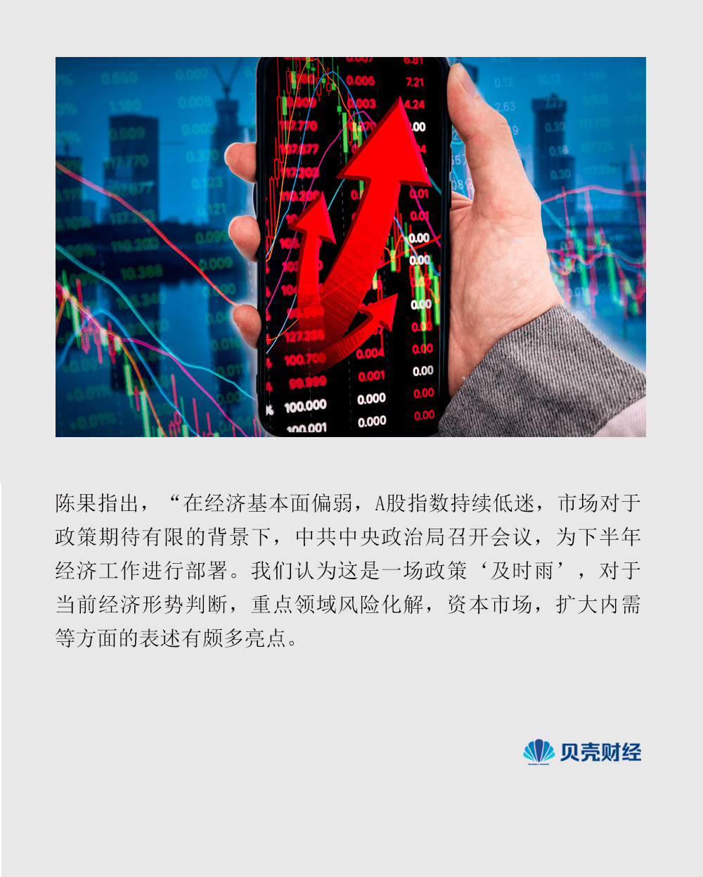 陈果指出,“在经济基本面偏弱,A股指数持续低迷,市场对于政策期待有限的背景下,中共中央政治局召开会议,为下半年经济工作进行部署。我们认为这是一场政策‘及时雨’,对于当前经济形势判断,重点领域风险化解,资本市场,扩大内需等方面的表述有颇多亮点。