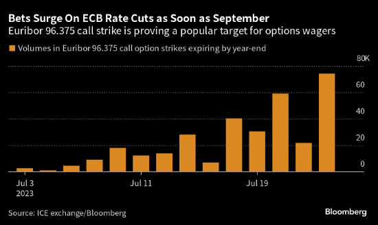 交易员正在买入与3个月期欧元银行间拆借利率(Euribor)相关的期货期权。他们的押注集中在执行价96.375左右,相当于利率大约3.625%。如果本周的第九次加息被证明是最后一次,然后是今年降息,或者市场预计2024年初很快降息,那么他们就会赚钱。