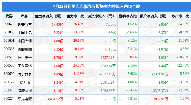 从资金流向上来看,当日阿里巴巴概念股板块主力资金净流入37.25亿元,游资资金净流出18.42亿元,散户资金净流出18.83亿元。阿里巴巴概念股板块个股资金流向见下表: