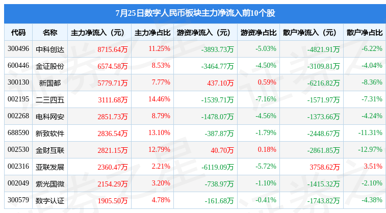 从资金流向上来看,当日数字人民币板块主力资金净流入3.1亿元,游资资金净流出1.99亿元,散户资金净流出1.11亿元。数字人民币板块个股资金流向见下表: