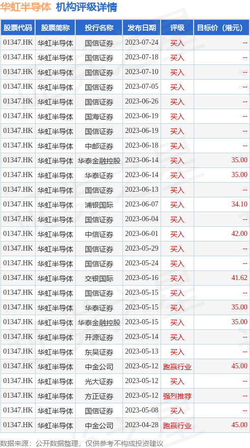 截至2023年7月25日收盘,华虹半导体(01347.HK)报收于25.6港元,上涨3.23%,换手率0.75%,成交量980.66万股,成交额2.49亿港元。投行对该股的评级以买入为主,近90天内共有24家投行给出买入评级,近90天的目标均价为38.64港元。国信证券最新一份研报给予华虹半导体买入评级。