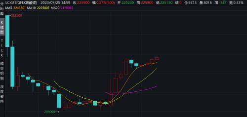 7月25日,碳酸锂期货表现强势,盘面迎来大幅反弹。截至25日收盘,主力合约LC2401触及涨停,报225900元/吨,涨幅6.99%。远月合约LC2402、LC2404、LC2403、LC2405合约均拉升涨停,LC2406涨6.88%、LC2407合约涨7.11%。从全部合约来看,成交量上升至7.43万手,超过首日成交量约9000手,持仓量增加至1.5万手,碳酸锂期货参与度稳步提高。