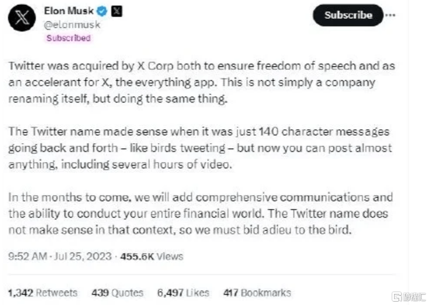 马斯克写道,推特被X取代,一方面是为了确保言论自由,另一方面也是为了促进X这个万能应用的发展。这不仅仅换个名字继续做同样的事情。