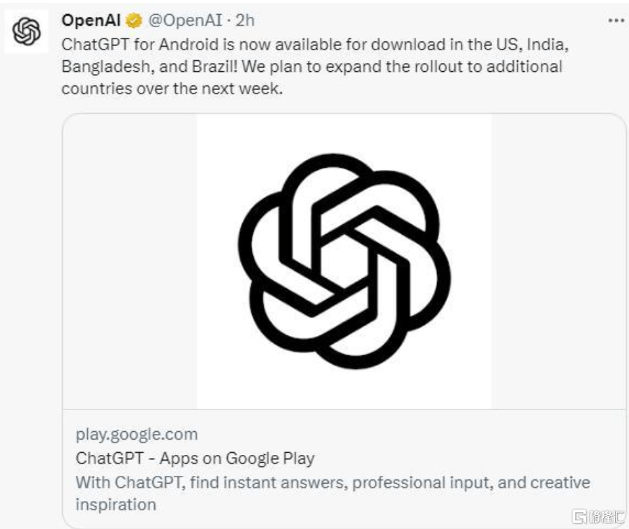 继App上架苹果应用商店以后,当地时间周二,OpenAI宣布,现在美国、印度、孟加拉、巴西四个国家的用户可以在谷歌的Google Play下载安卓版ChatGPT的App,并提供了相关链接。