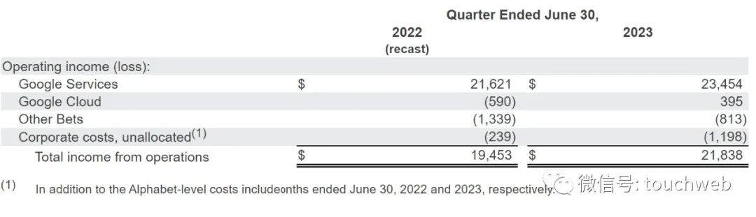 Alphabet在2023年第二季度运营利润为218.38亿美元;其中,来自谷歌服务的运营利润234.54亿美元,上年同期的运营利润为216.21亿美元;来自谷歌云的运营利润3.95亿美元,上年同期的运营利润为-5.9亿美元;