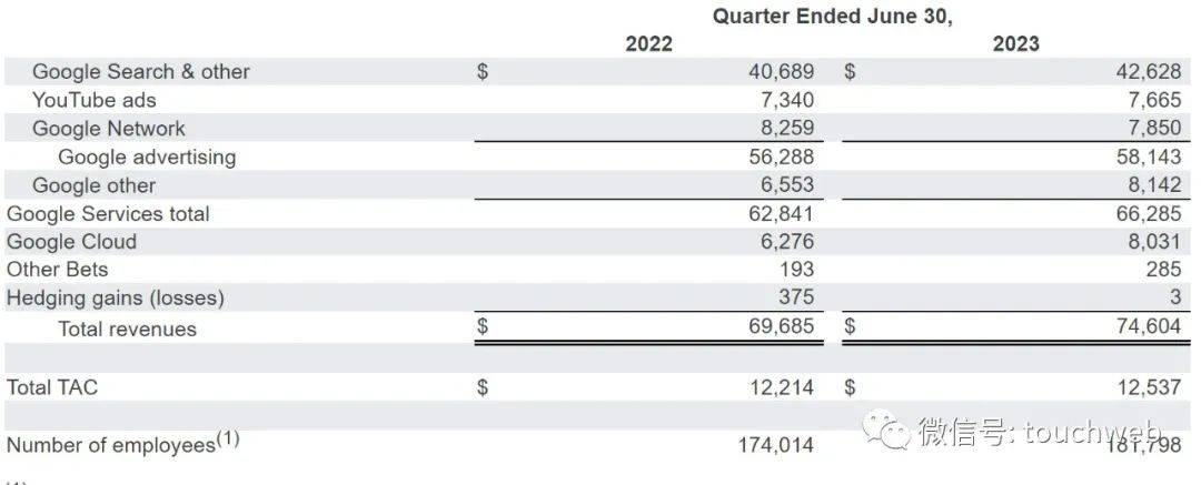 其中,Alphabet在2023年第二季度来自谷歌广告收入为581.43亿美元,上年同期的营收为562.88亿美元;来自谷歌其他收入为81.42亿美元,上年同期的营收为65.53亿美元。