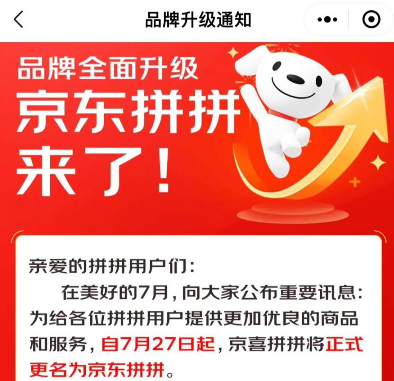 京喜拼拼宣布品牌升级:7 月 27 日起更名为京东拼拼