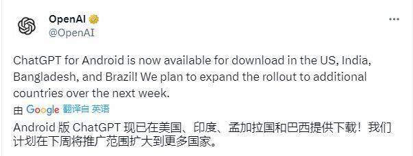 OpenAI 表示,下周将在更多国家推广安卓版 ChatGPT。(来源:新浪科技)