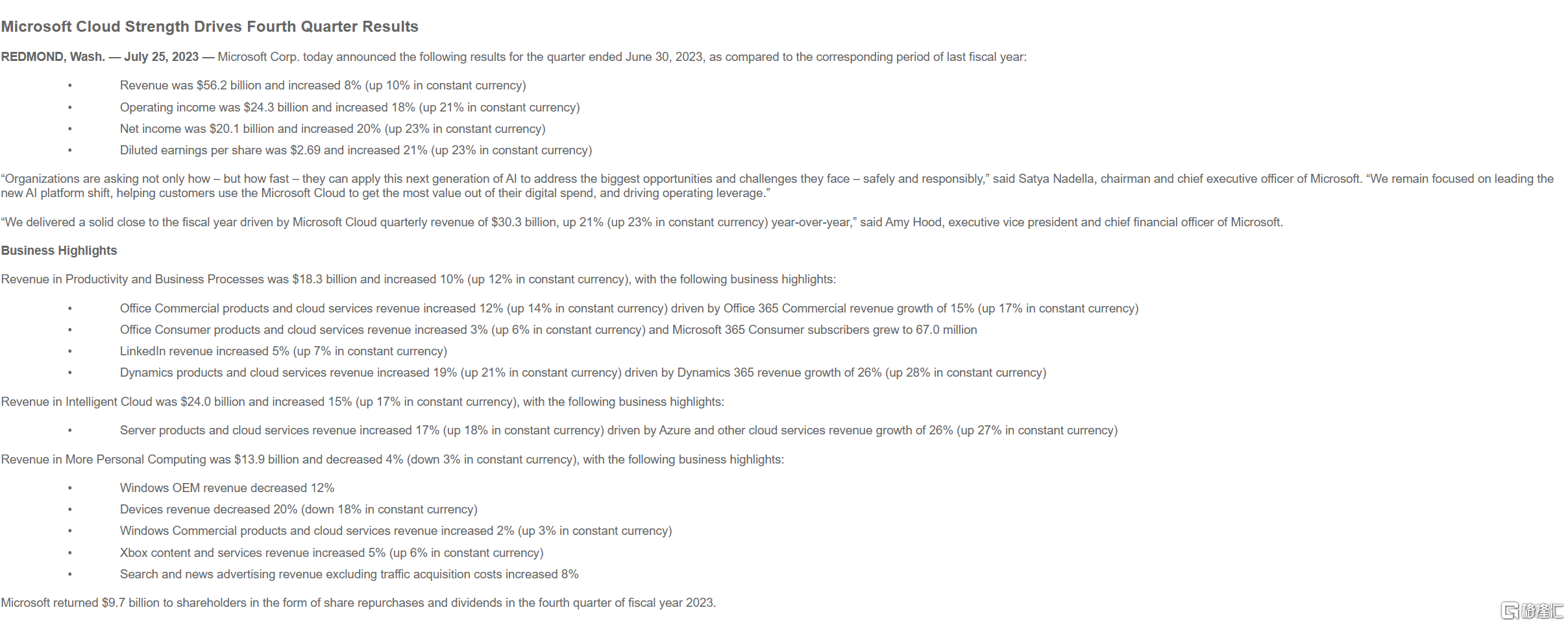 2024全财年来看,微软预计,营收和成本的增长率将高于2023财年;资本开支将在2024财年逐个季度增长,资本支出将用于数据中心、CPU芯片、GPU芯片和网络设备;同时运营开支将保持“低速”增长;预计2024财年汇率影响将使总收入增长约增加1个百分点。