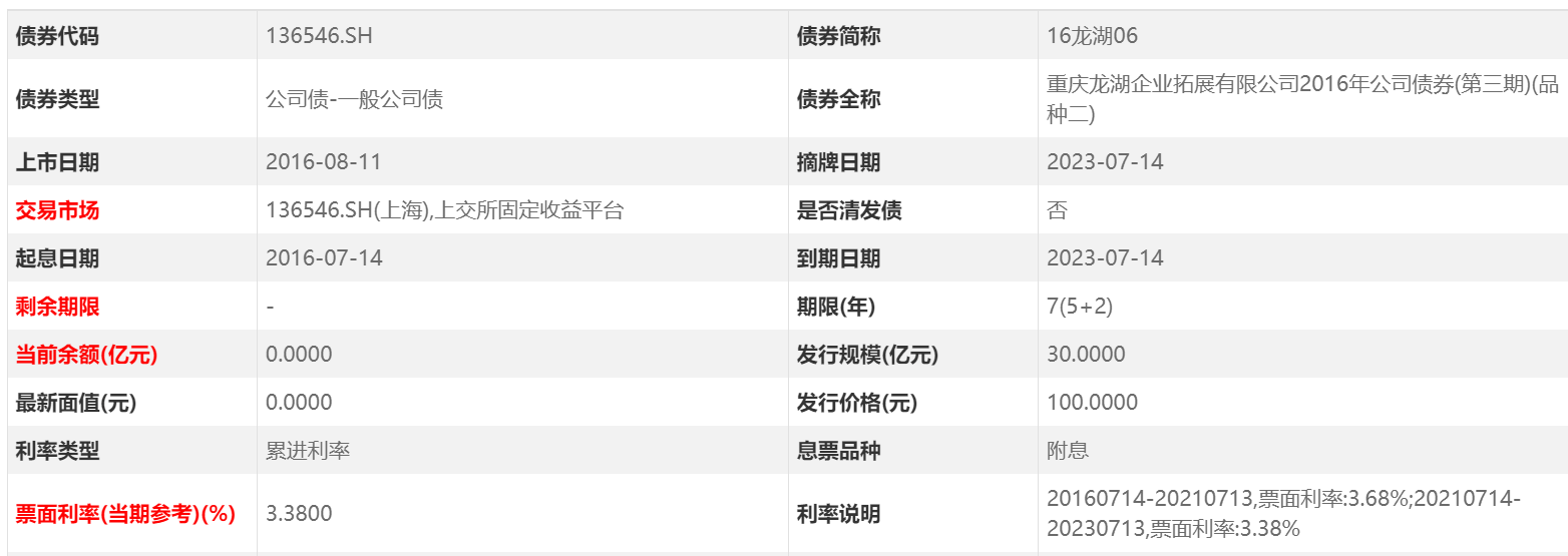 据Choice金融终端显示,龙湖集团发行的债券“16龙湖06”、 “20龙湖拓展MTN001A”均已在7月14日兑付摘牌,“16龙湖06”是龙湖2016年发行的公司债,规模为30亿元,票面利率3.68%,发行期限为7年;“20龙湖拓展MTN001A”是龙湖2022年发行的中期票价,规模为12亿元,票面利率为3.95%,发行期限为3年。