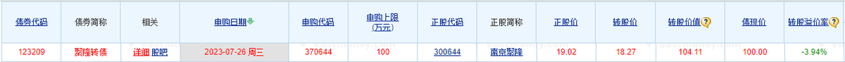 聚隆转债是南京聚隆发给原有股东的一项“隐藏福利”,持有正股的股东可优先配售新可转债。每持有一股可配售2.0268元聚隆转债,配售10张即相当于网上投资者打新中一签所需的股数为494股,折合持股市值为9395元。