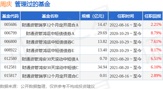 周庆先生:中国国籍,复旦大学工商管理硕士,2016年3月加入财通证券资产管理有限公司,历任固收私募投资部高级产品经理、固收私募投资部投资经理助理、固收私募业务投资决策委员会委员、固收公募投资部高级经理。2021年8月20日担任财通资管鸿安30天滚动持有中短债债券型发起式证券投资基金基金经理。2022年8月16日起担任财通资管瑞享12个月定期开放混合型证券投资基金基金经理。
