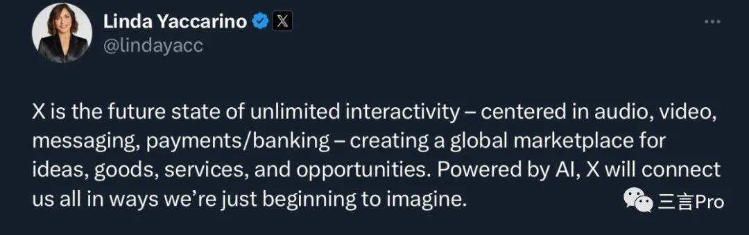 今年7月24日,新上任的推特CEO Linda Yaccarino发推称,X是无限交互的未来形态,以音频、视频、消息、支付/银行为中心,为创意、商品、服务和机会创建一个全球市场。在人工智能支持下,X将会连接所有人。