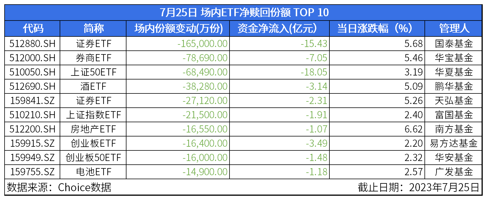 Choice数据显示,2023年7月25日,沪深ETF市场遭净赎回258,974.33万份,结束连续6个交易日净申购的行情。其中上证ETF遭净赎回267,379.67万份,深证获净申购8,405.34万份。市场情绪转向个股市场。