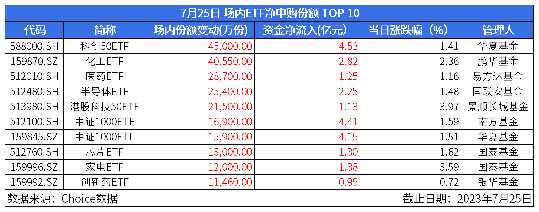 净申购方面,资金流向宽基指数趋势明显。华夏科创50ETF(588000)、南方中证1000ETF(512100)、华夏中证1000ETF(159845)资金净流入均超4亿元。细分主题产品中,鹏华化工ETF(159870)、国联安半导体ETF(512840)资金净流入均超2亿元,备受资金关注。