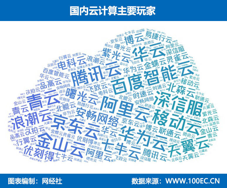 据网经社企业库(COP.100EC.CN)显示,当前,国内云计算主要玩家包括:1)头部云计算厂商:阿里云、腾讯云、京东云、华为云、百度智能云;2)中腰部云计算厂商:金山云、移动云、华云、青云、深信服、天翼云、浪潮云、七牛云、安畅网络、曙光云、优刻得、北森云、紫光云、电科云、博云、金蝶云、灵雀云、品高云、联通云、易捷行云、又拍云、时速云、飞致云、行翼云、北鲲云等;3)长尾云计算厂商:恒生云、天成云、安恒云、白山云、蓝云、首云、网宿云、太极云、苏宁云、蓝汛云、讯飞AI云、汉得云、微盟云、超图云、有赞云、慧算账、兴业云、华云、百望云、灵雀云、坚果云、英方云、明道云等。