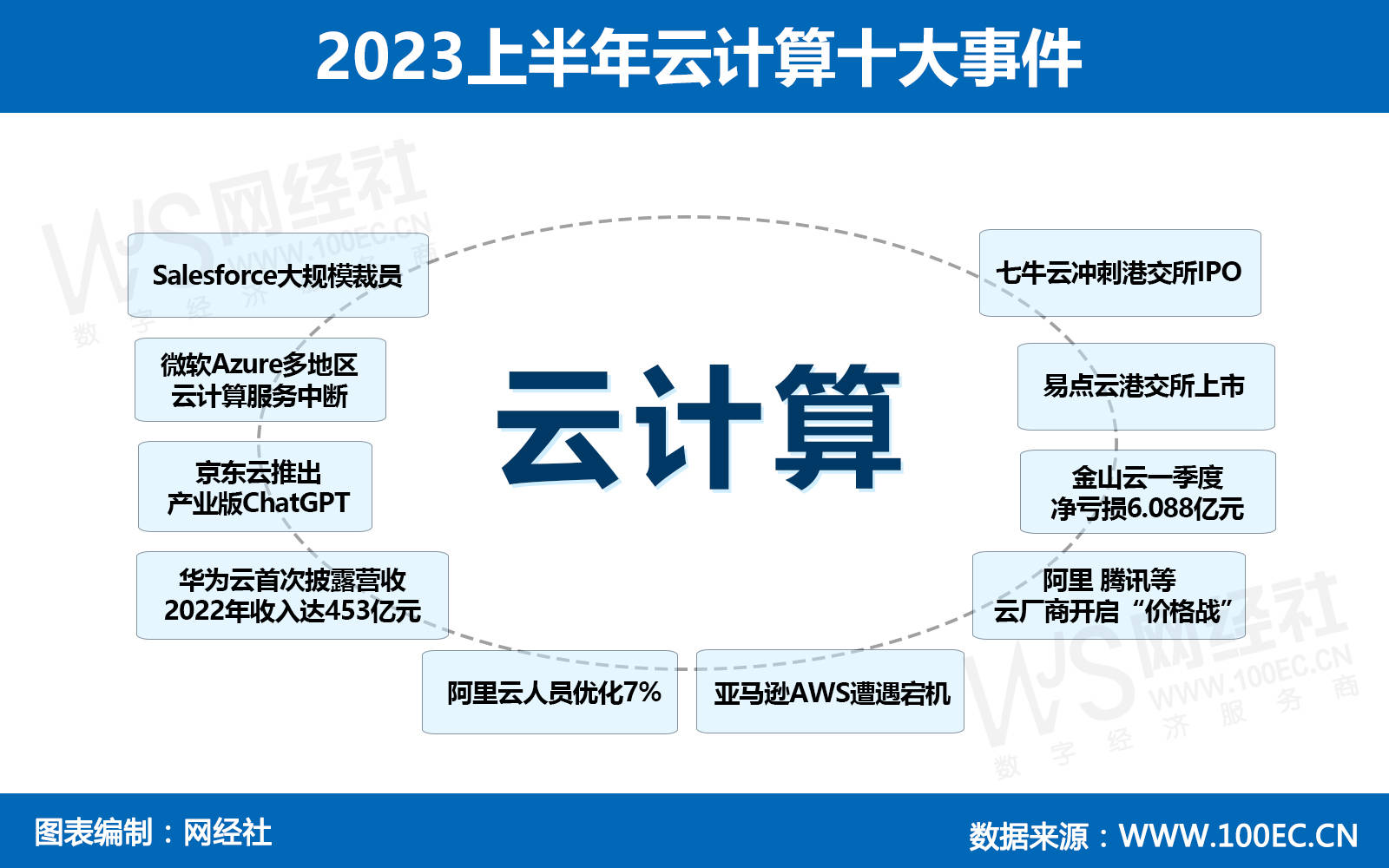 2023年已过大半,云计算领域又发生哪些大事?阿里云、Salesforce裁员,亚马逊、微软云宕机,易点云港交所上市,网经社云计算台(CC.100EC.CN)长期跟踪云计算,以下为我们通过第三方视角对2023年上半年云计算十大事件进行盘点。(详见网经社专题:裁员不断 宕机频繁 复盘云计算十大事件https://www.100ec.cn/zt/yjsS2023/)