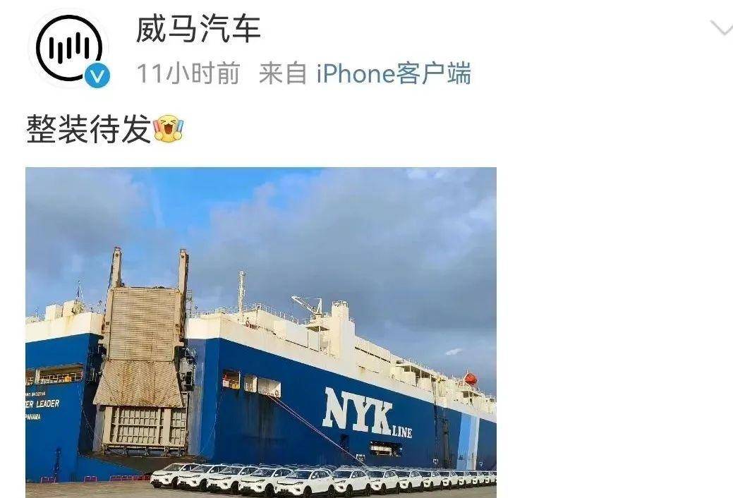 威马汽车发布的图片显示,一艘蓝色货轮旁停放着一排排EX5车型等待发运。尽管该微博并未透露该批车型将发往何处,但不少网友表示:“威马绝地逢生,出海了?”