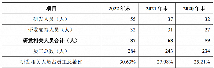 近三年来,公司研发人员数量稳步增长,从2020年末的32人增长至2022年末的55人,研发相关人员占员工总数比例也从2020年末的25.21%增长至2022年末的30.63%。