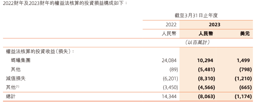 与蚂蚁集团有关的权益法核算的投资收益同比下降,主要是由于蚂蚁集团持有的投资的净投资收益下降以及蚂蚁集团的经营利润下降。