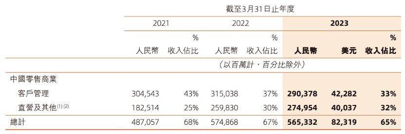 2023财年,阿里巴巴来自中国零售商业的收入为5653.31亿,相较2022财年下降2%,其中客户管理收入下降8%,主要由于消费需求减少、竞争持续、以及疫情导致供应链和物流受到影响。2023财年,直营和其他业务收入为2749.54亿,较2022财年增长6%,主要是由于盒马和阿里健康的直营业务收入增长贡献。