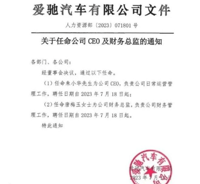 近日,爱驰汽车发布了关于任命公司CEO及财务总监的通知,任命朱小华为公司CEO,负责公司日常运营管理工作,聘任日期自2023年7月18日起;任命唐梅玉为公司财务总监,负责公司财务管理工作,聘任日期自2023年7月18日起。