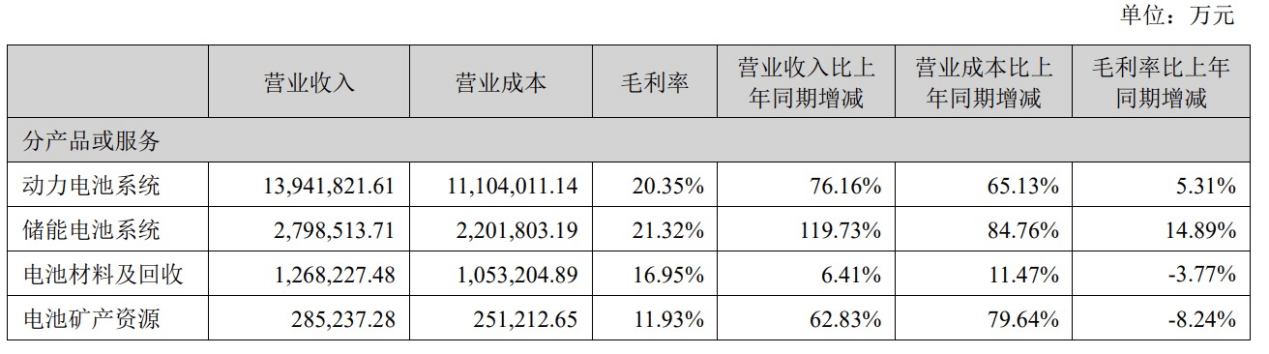 其中,营收占比超七成的动力电池系统毛利率达20.35%,同比增加5.31个百分点。营收占比14.79%的储能电池系统毛利率达21.32%,更是同比增加了14.89个百分点。