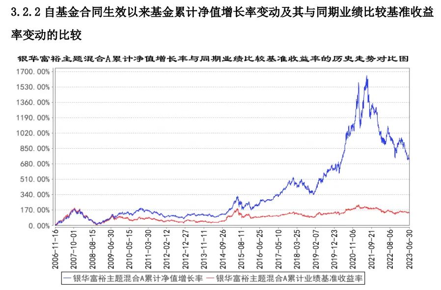 作为一只累计回报超过700%的大牛基,银华富裕主题混合并不是从今年2季度才开始亏损的。从季报披露的净值增长率走势图不难看出,该基金的回报峰值在2021年,净值增长一度超过1600%,随后便转入下跌趋势,直至今日。